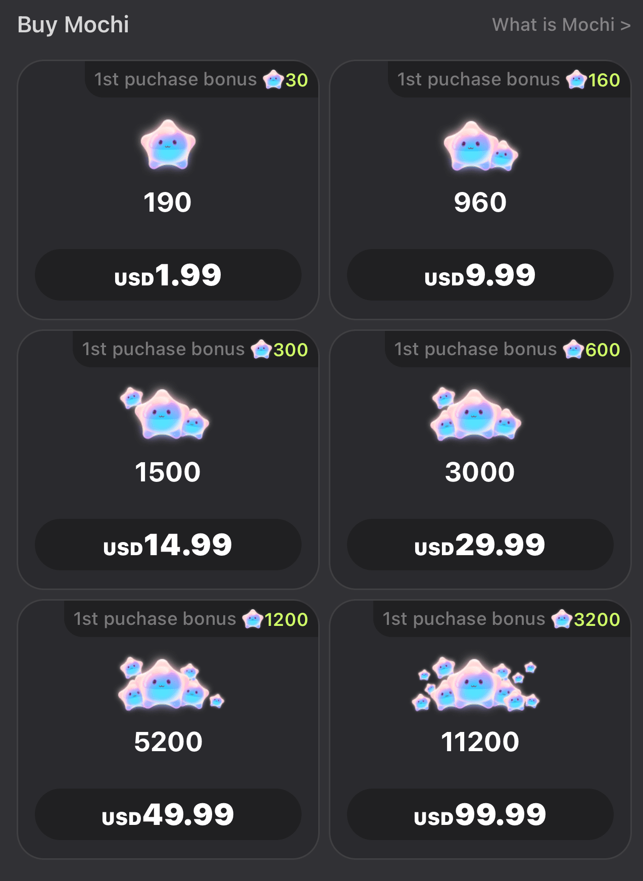 Mochi is a virtual token used for the Emochi app.You can use Mochi to chat with more advanced models. If you want to experience more features on the Emochi app, you can choose between two methods. Firstly, purchase mochi directly.
